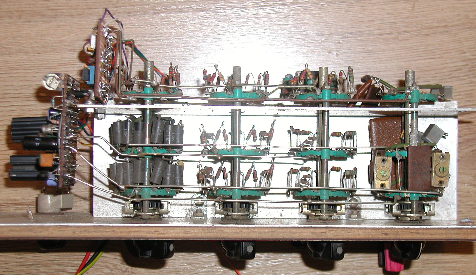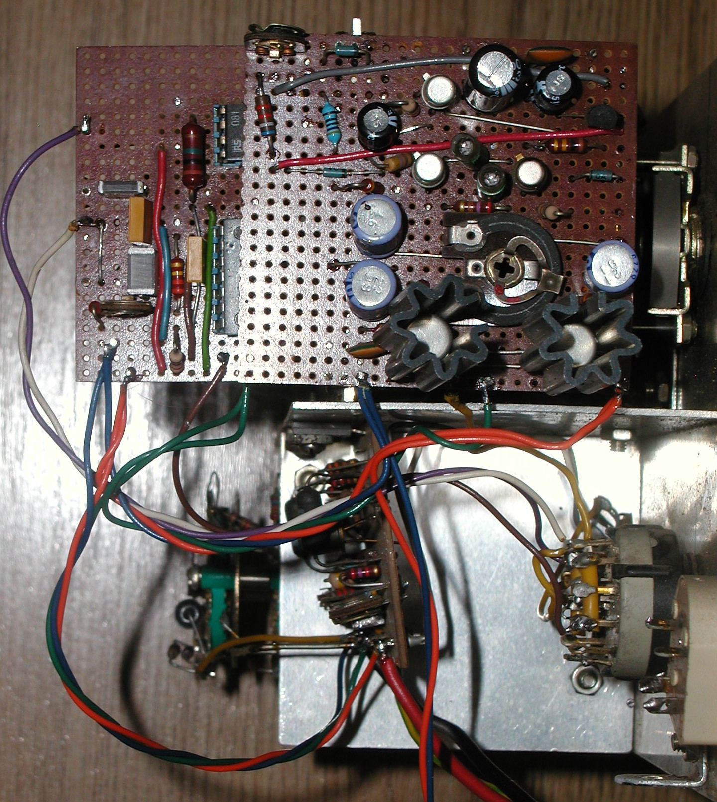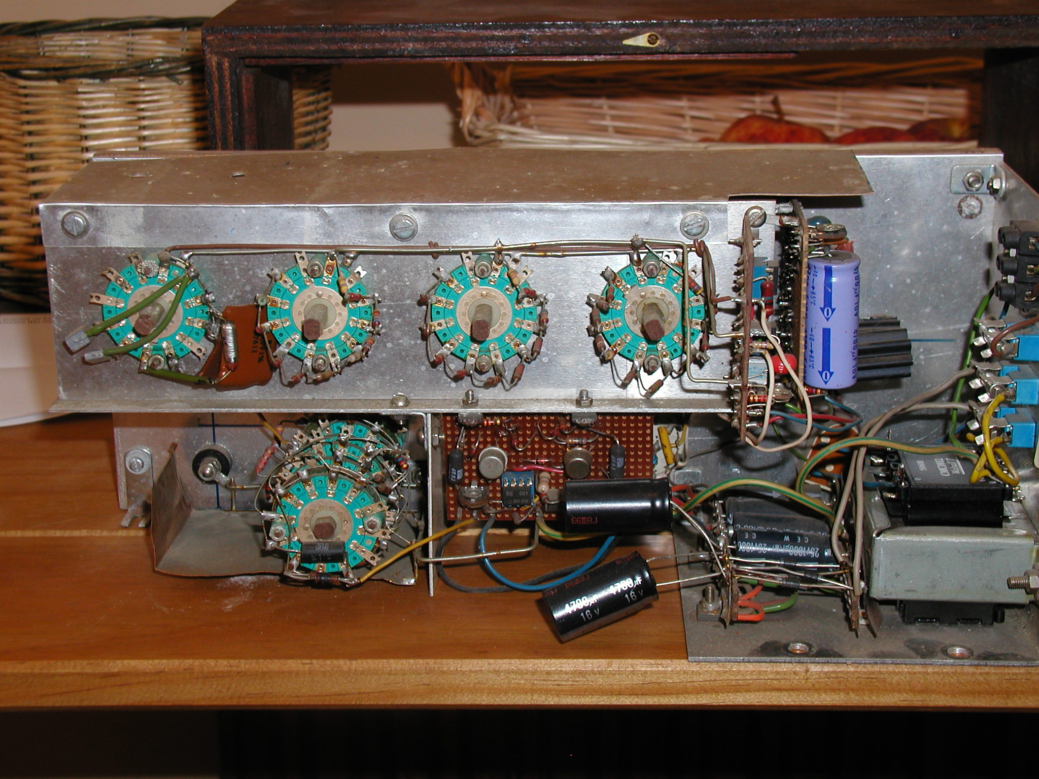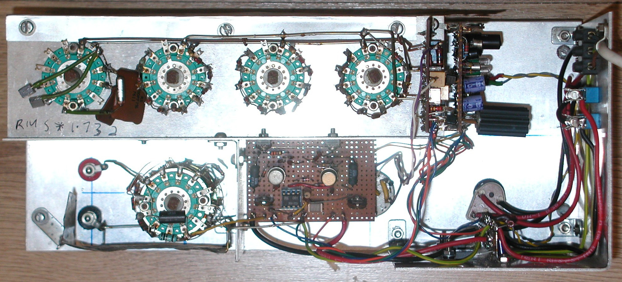 As you can see, it's quite heavily screened. The top 'box' screens the actual sine wave selection caps and resistors. These were hand picked to get a truly balanced bridge and accurate tracking. The ones you can see are just for the triangle wave shaping.