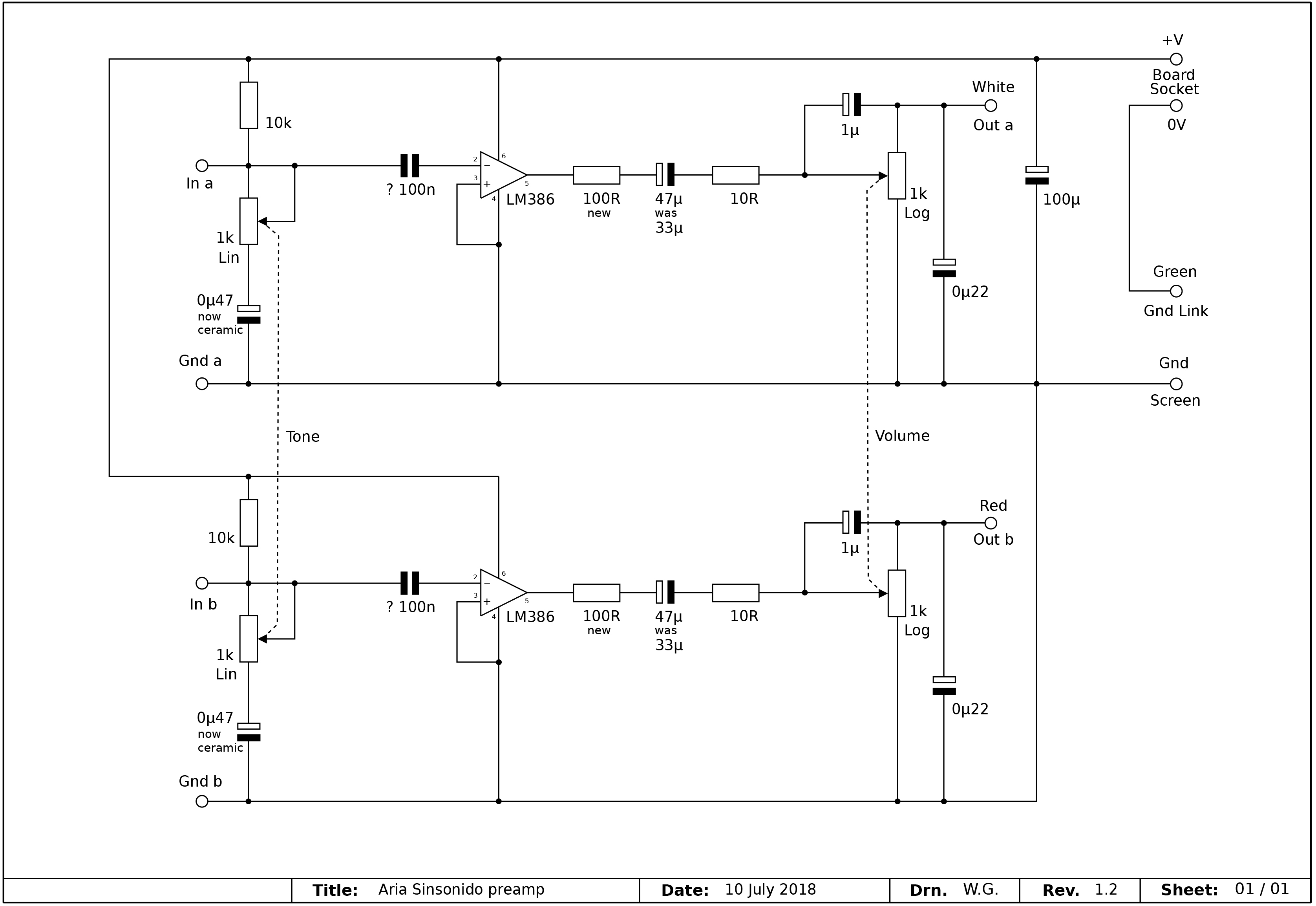 The first scale is with the tone control set to maximum bass (ie max treble roll-off). It sounds like a bass guitar, and you can clearly hear the stereo separation with lower notes on the left of the image and higher to the right. The second scale is with the tone control set to max treble. You can hear there is a lot more HF, and clearly hear sound of my fingers sliding across every string. The two notes at the end are open strings, with max treble and max bass.