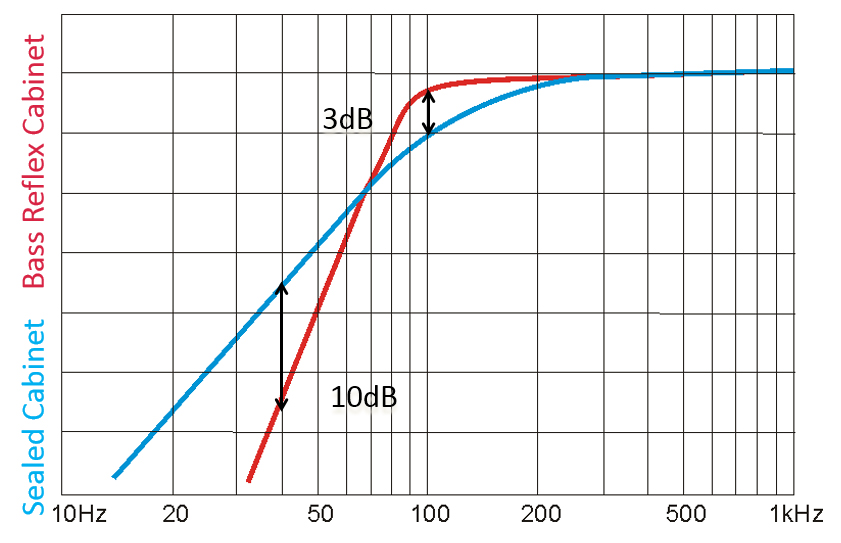 The other thing to consider is the type of speaker cabinet because that affects the roll-off rate or slope. The bass roll-off is much faster and steeper from a ported cabinet (typically) than a sealed cabinet, for example. So while the figures for a ported cabinet might appear to have greater bass extension (ie, a lower -6dB frequency figure) than a similarly sized sealed cabinet, the latter will still be reproducing audible bass at a much lower frequency than the ported cabinet because the bass rolls-off more gently -- as this diagram illustrates. Here the -3dB figure for the sealed cabinet might be 100Hz, while that of the ported cabinet is closer to 60Hz... but at 40Hz the sealed cabinet's output is some 10dB greater than that of the ported cabinet! So it's complicated...