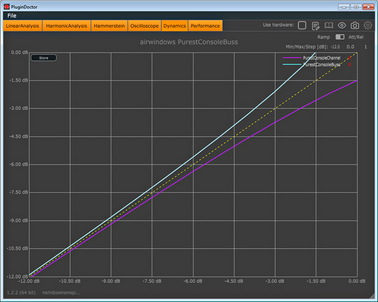 Finally, to the reasons for these changes. The Airwindows Console plug-ins add slight 'pre-distortion' to each channel via its Channel plug-in instances, and then the combined mixed signal is passed through a single Console Buss plug-in, which provides the reciprocal 'undistort' curve: