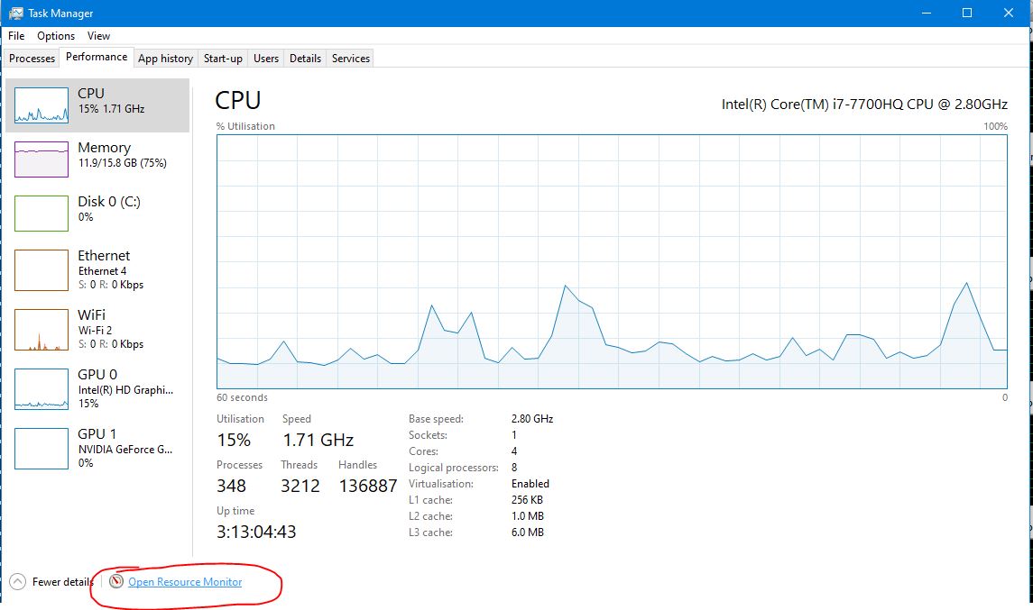 You can confirm this by clicking the 'Performance' tab in the Task Manager and then clicking 'Resource Monitor' at the bottom of the window: