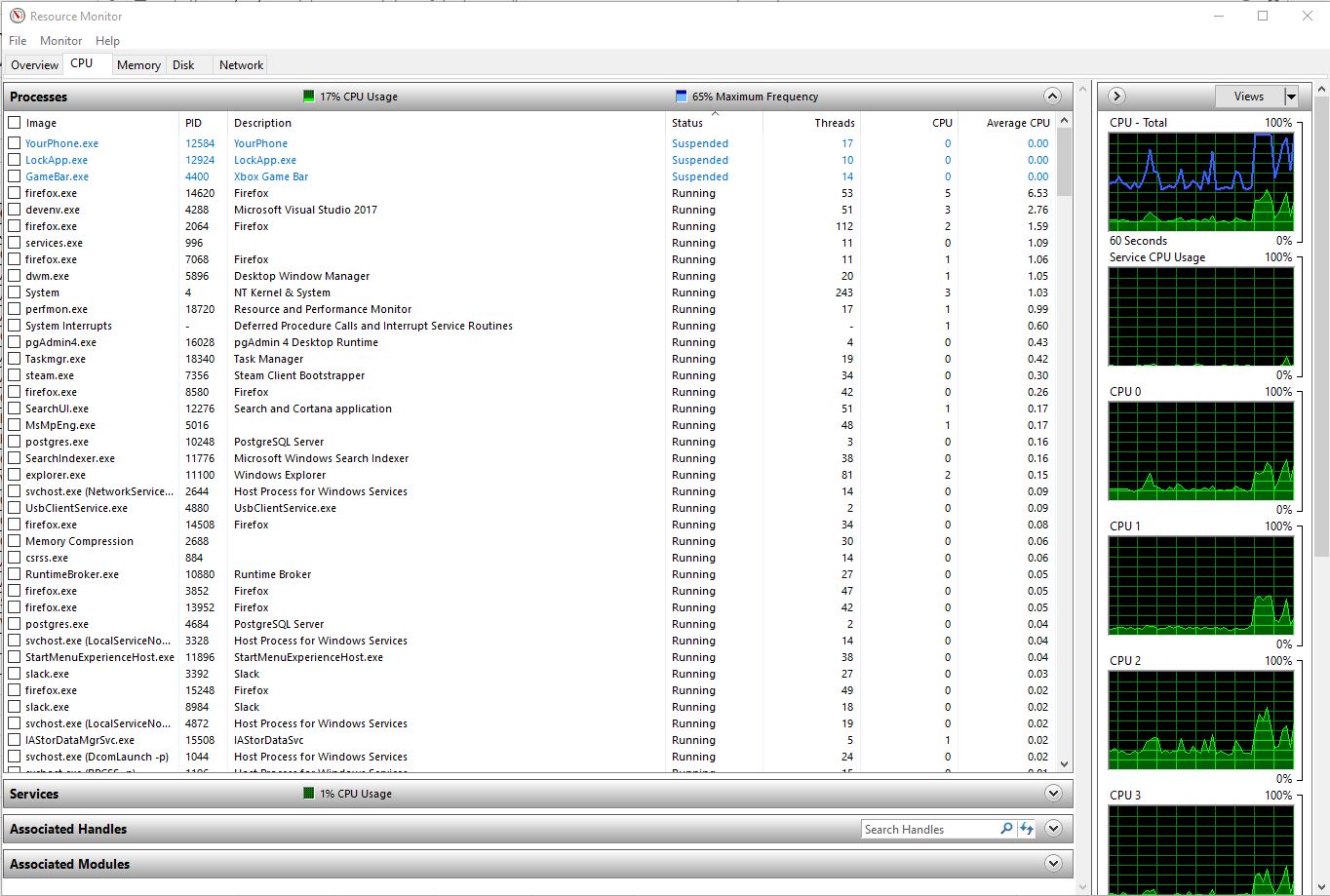 Once in the the Resource Monitor, click the 'CPU' tab and it will show you a breakdown of each individual core. If there are one or two cores running at high load and the rest are relatively idle that would confirm that Studio One is not using all the cores for the workload you are asking of it in the DAW: