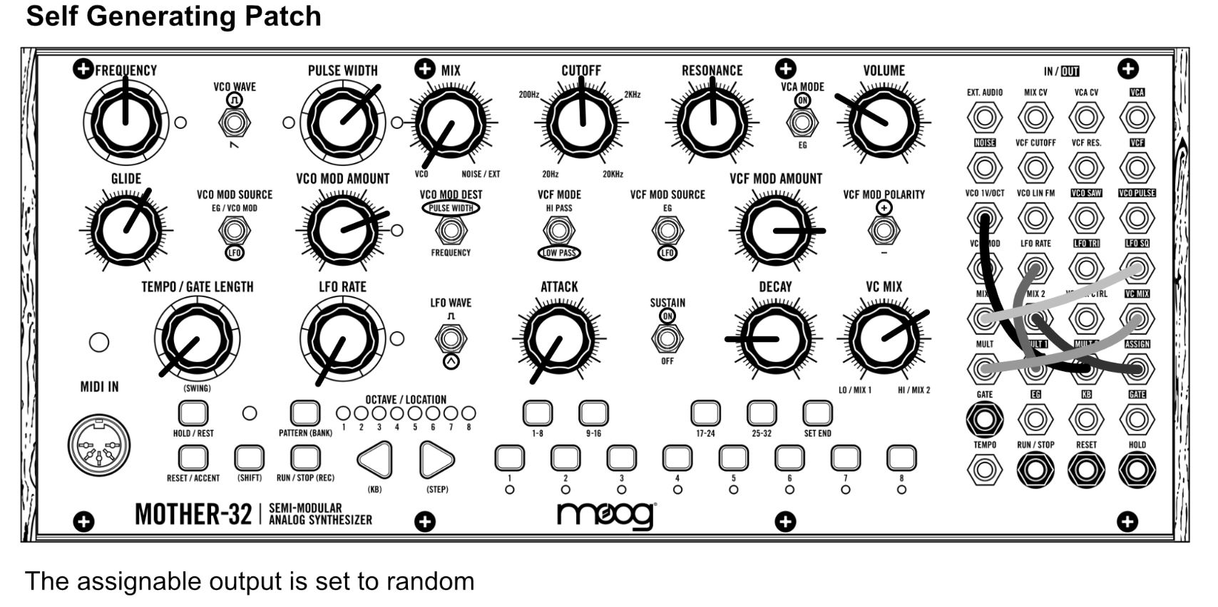 On a related note, the Mother-32 is capable of self-generating patches in the real sense. Here's one and this is the patch sheet for it:
