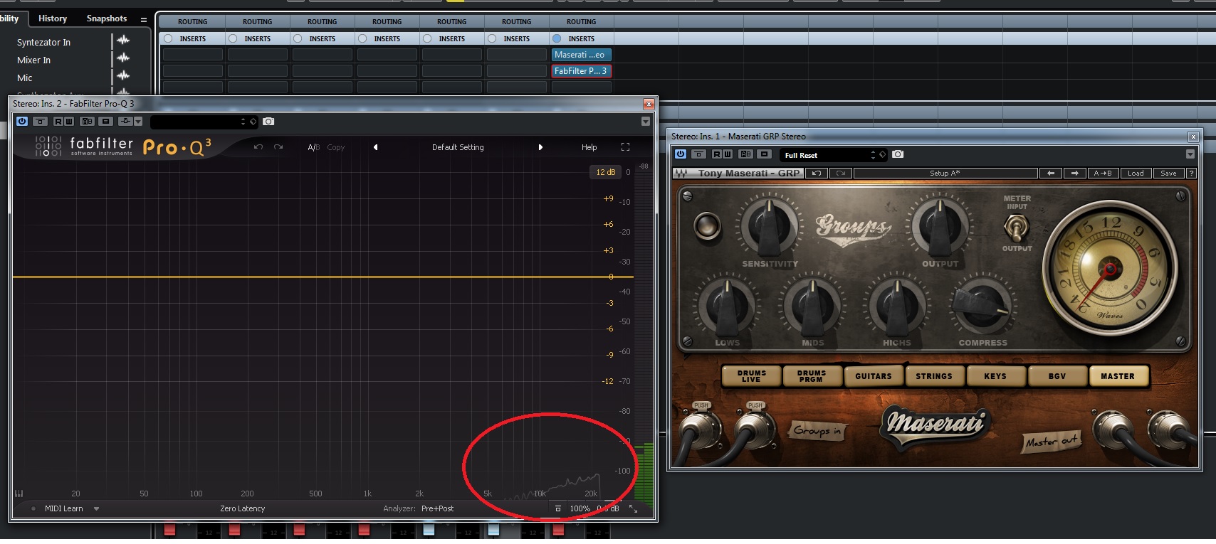 Question, why when I'm placing Waves "Maserati GRP Stereo" PlugIn in the "Master mode", and then placing FabFilter Pro-Q3, the EQ indicates some noise between ~7k and 20k?