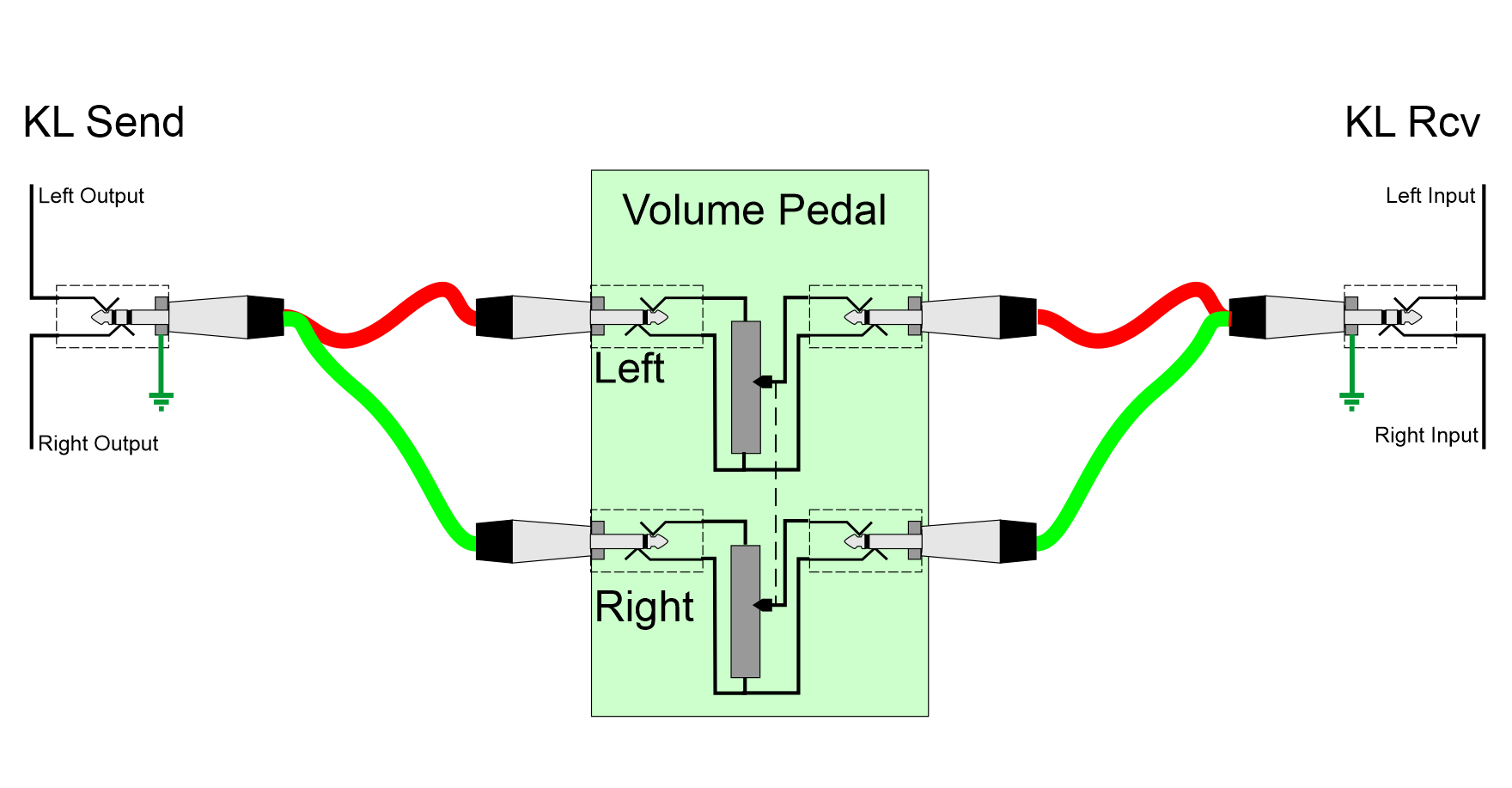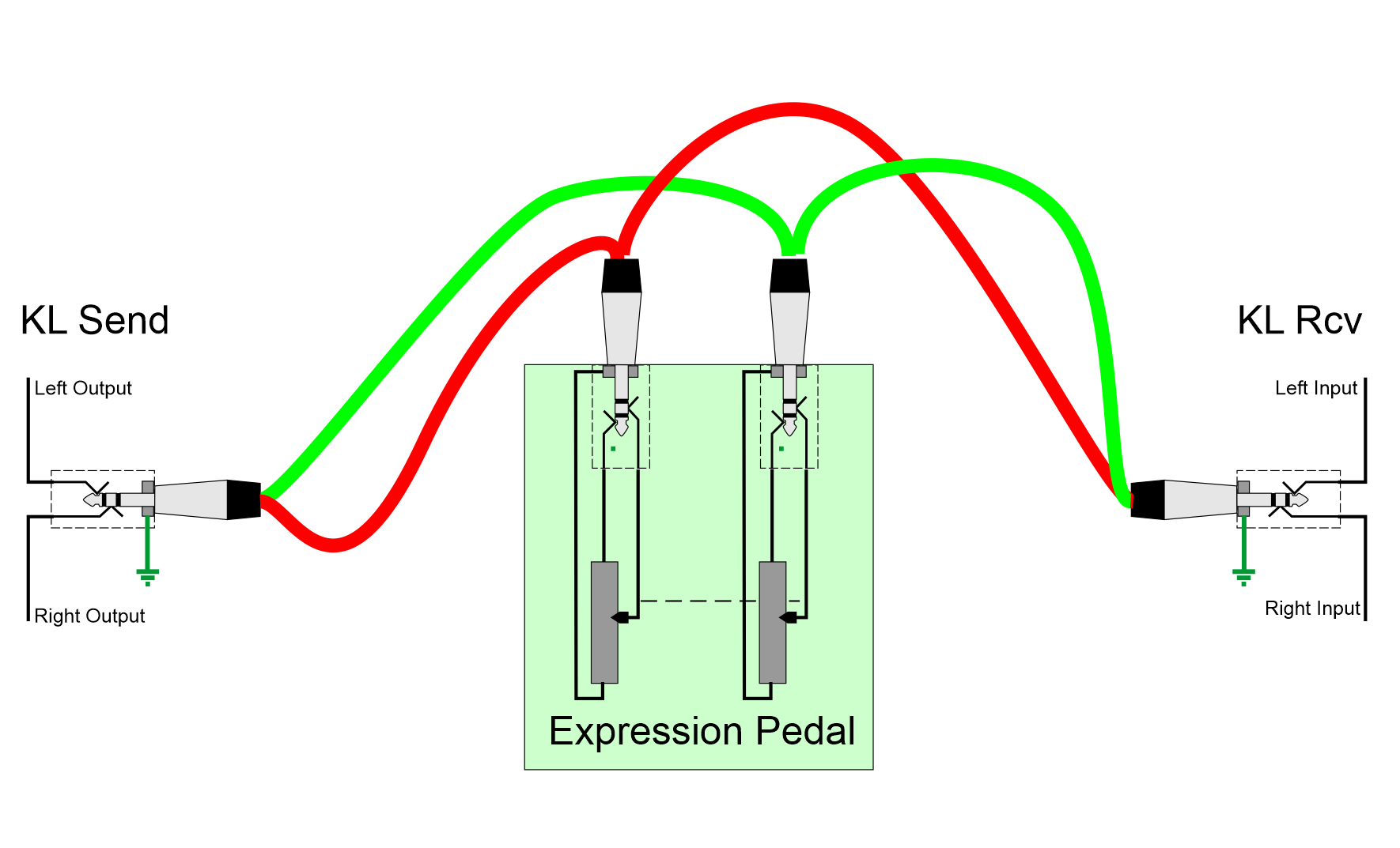 The KL requires a stereo volume pedal with a 25k Ohm (audio taper) dual pot. The mixed audio through the KL is routed out through the pedal and back, so it needs to be a good quality pedal with a quiet and reliable pot. Radial recommend an Ernie Ball 25k stereo pedal, but its very expensive.