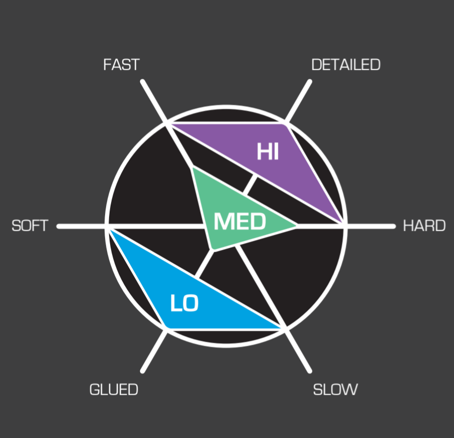 Lo = 220 Ohms, Med = 1200 Ohms, Hi = 2800 Ohms.