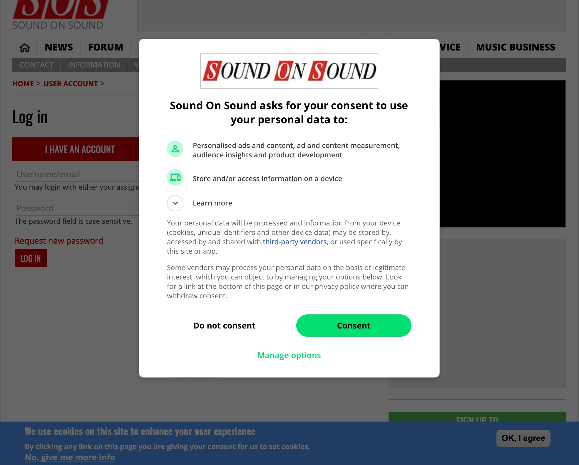 I get the banner along the bottom with the "OK I Agree" button. Previously it was cyan like the example shown, but after clearing all the SOS cookies it was dark grey.