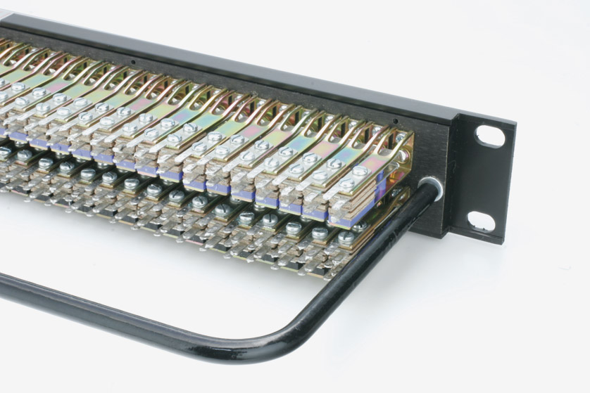 Cables from each socket are secured to, and run along the bar to the side, and then secured to the rack side frame, normally with a sufficient loop to allow the panel to be hinged out from the front for servicing.