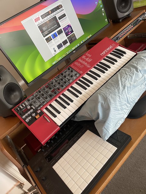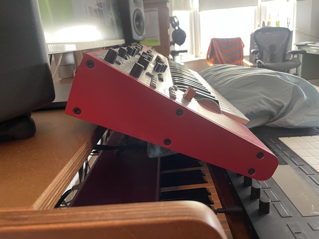 The weight of the keyboard at the front keeps a balancing upward at the back. Additional pressure at the front (from playing) doesn't then cause it to move away from the shelf. The arms that go front to back can be shaped to go under your screen but over the mount. Hook the back in place, drop down the front, add your keyboard to make it secure.