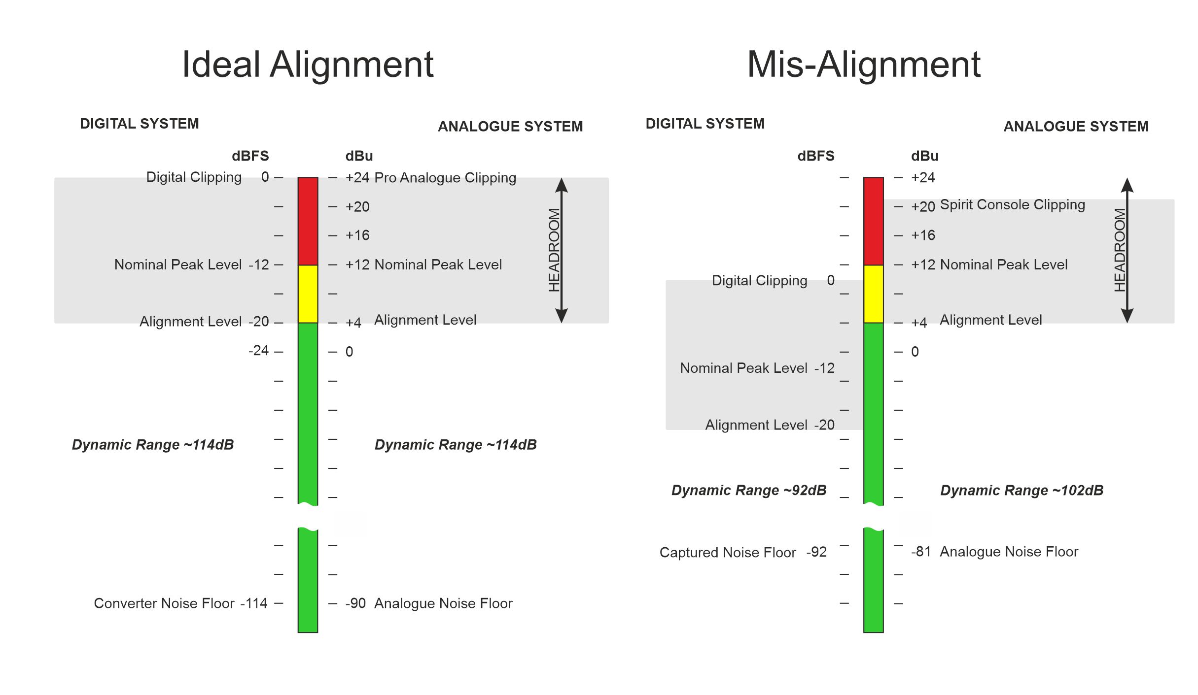 The section on the left shows the SMPTE's recommended analogue-digital alignment. It is based on the idea that the highest peak signal level a professional analogue is intended to handle before clipping is around +24dBu. The analogue console noise floor is going to be somewhere between -90 and -100dBu, depending on the console quality and the number of routed channels etc.
