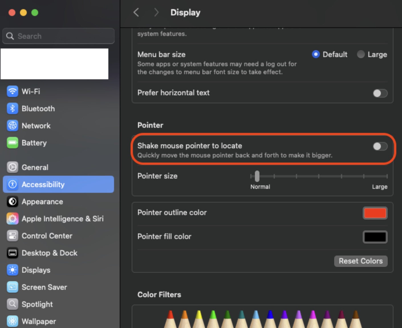 It is controlled in SETTINGS > Accessibility > DISPLAY then scroll down to POINTER and change settings/colours. Maybe switch OFF the Shake mouse to locate Pointer option also if that's causing you any problems?