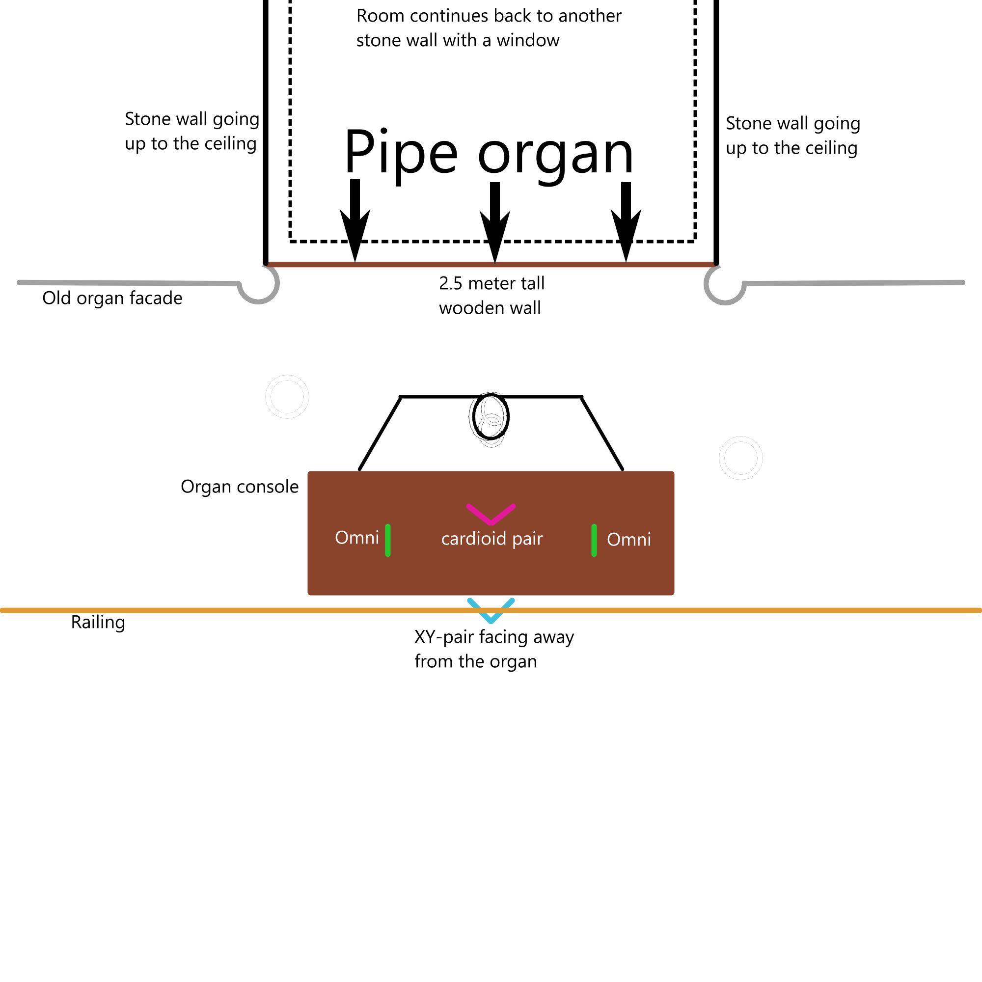 I made a layout of the organ loft and how I set up the microphones. Here it is:
