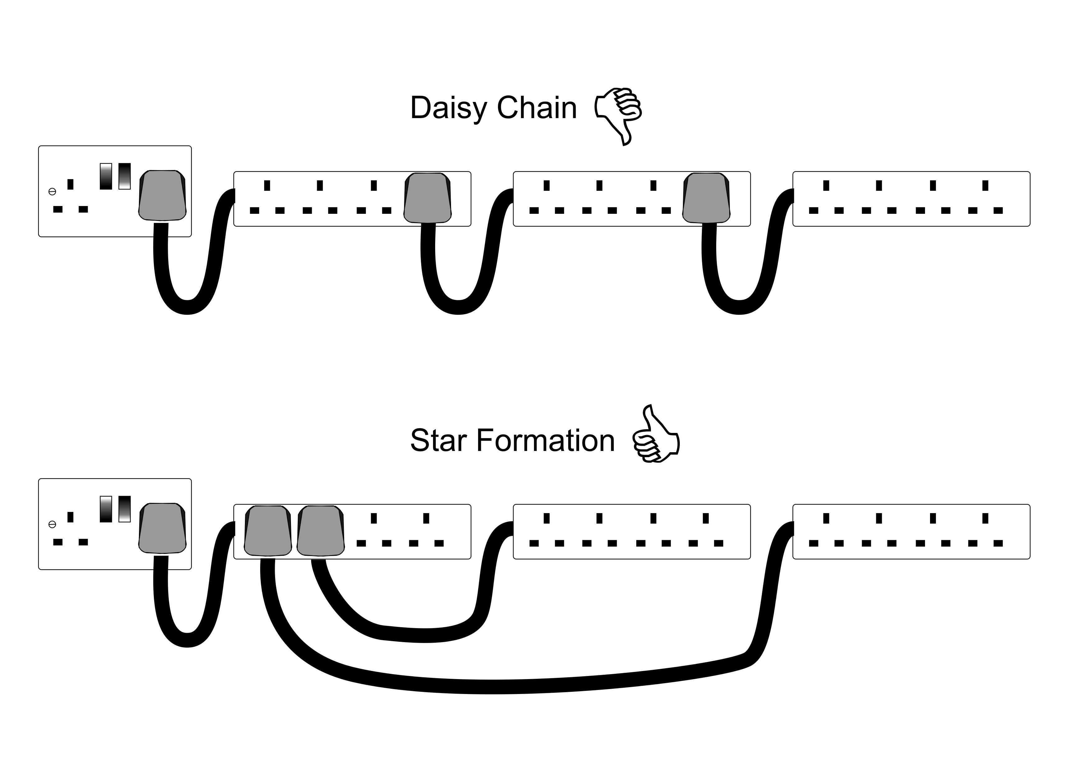 I have been reading articles on this website about powering all kit from a single dual wall socket and I have to say I am confused. Articles I've read here recommend a star formation with extension leads is a way of avoiding ground loops, but elsewhere on the net I've read that plugging extension leads into other extension leads is dangerous. I understand the concept of overloading wall sockets and what may happen as a consequence which is fine, but the star formation as I understand it is effectively 'daisy chaining' albeit in a different way.