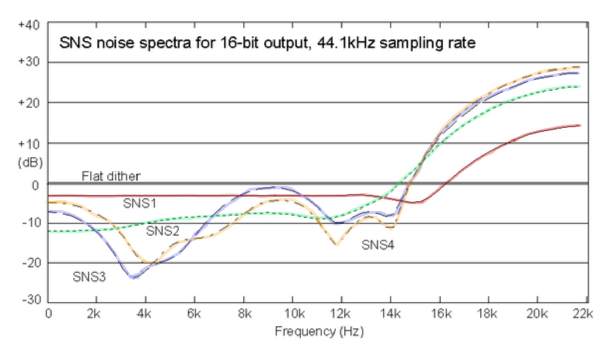 However, noise-shaped dithers can appear to give subjectively lower noise-floors -- so a 16-bit system can sound as quiet as a 20-bit system, for example -- by shifting a lot of the dither signal from the parts of the spectrum where we are most sensitive (in the 2-4kHz region) to areas where we are least sensitive (18-20kHz).