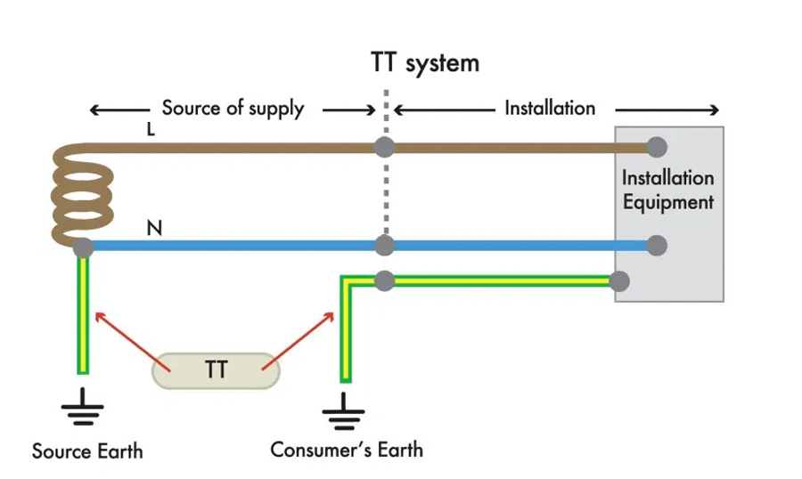 So, a TT system provides Line and Neutral connections from the supply substation (or pole transformer) to the building (and the Neutral is bonded to Earth at the substation in the standard way). But there is no separate Earth connection to the building from the substation -- only the Neutral and Line are connected. Instead, a local earth is provided via an earth spike or underground plate at the building. This arrangement is fairly common in older properties and in rural buildings fed by overhead cables, but as the earth impedance back to the substation via the soil is inherently variable (and higher than a direct connection) an RCD (GFCI) is required on incoming supply for shock protection.
