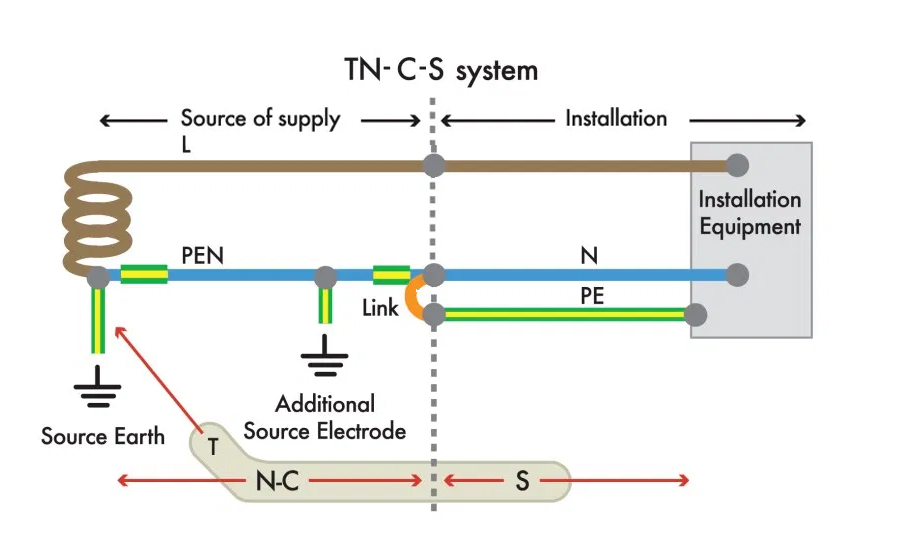 A variation of this supply arrangement is called TN-C, but this is used mainly only for mains supply distribution systems, where the Neutral conductor also serves as a Protective Earth, without the additional interim bonding. It is not normally found in consumer building supplies.