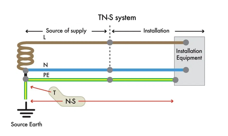 The TN-S system provides all three connections -- L, N and E -- between the substation and building. The Neutral is bonded to Earth at the substation as normal, but a separate Earth connection from the same point is also extended to the building, along with the Neutral and Line feeds.